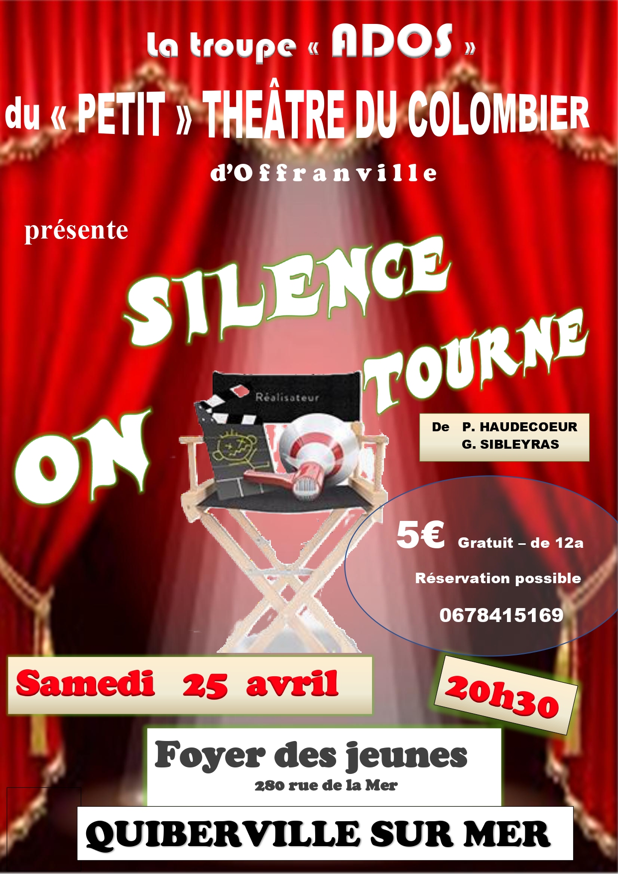 🎭 Rires garantis à Quiberville-sur-Mer ! 😂 La troupe ADOS du Petit Théâtre du Colombier d’Offranville vous invite à découvrir une comédie :👉 « Silence, on tourne ! » 📅 Samedi 25 avril à 20h30📍 Foyer des jeunes – 280 rue de la Mer📌 Quiberville-sur-Mer 💶 Tarif : 5€ (gratuit pour les -12 ans)📞 Réservation possible :…